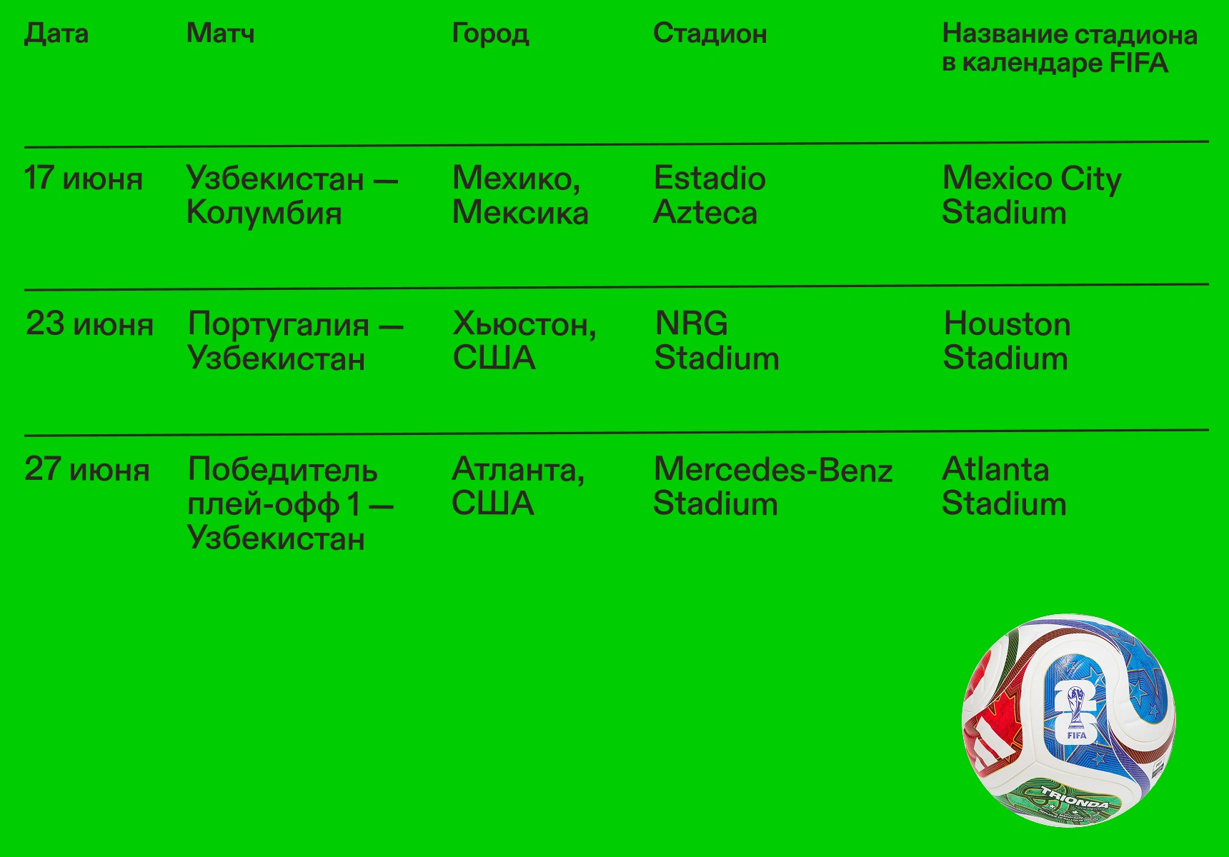 Сборная Узбекистана впервые выступит на чемпионате мира по футболу: сейчас известно, что за 11 дней она проведёт три игры в Мексике и США. Болельщикам, которые хотят посмотреть все матчи, придётся останавливаться в трёх городах: Мехико, Хьюстоне и Атланте.
