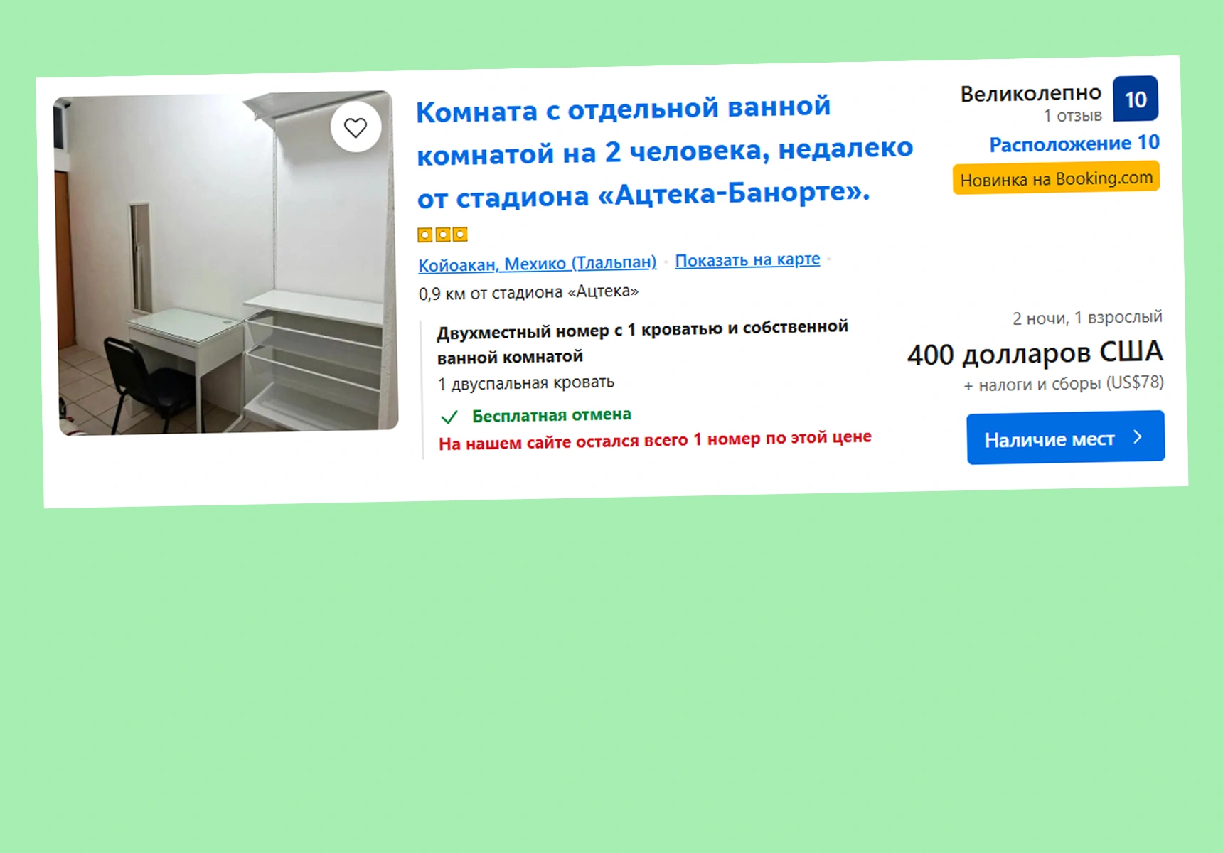В дни матчей жильё на 30–50% дороже, чем на даты до или после игры, особенно если оно рядом с метро, стадионами и транспортными узлами. В США и Мексике, по данным на февраль 2026 года, проживание стоит от 50–100 долларов за ночь в бюджетном сегменте и 200–500 долларов — в более комфортном. В сумах на аренду в среднем придётся потратить от 1,3 до 6,5 млн за сутки.