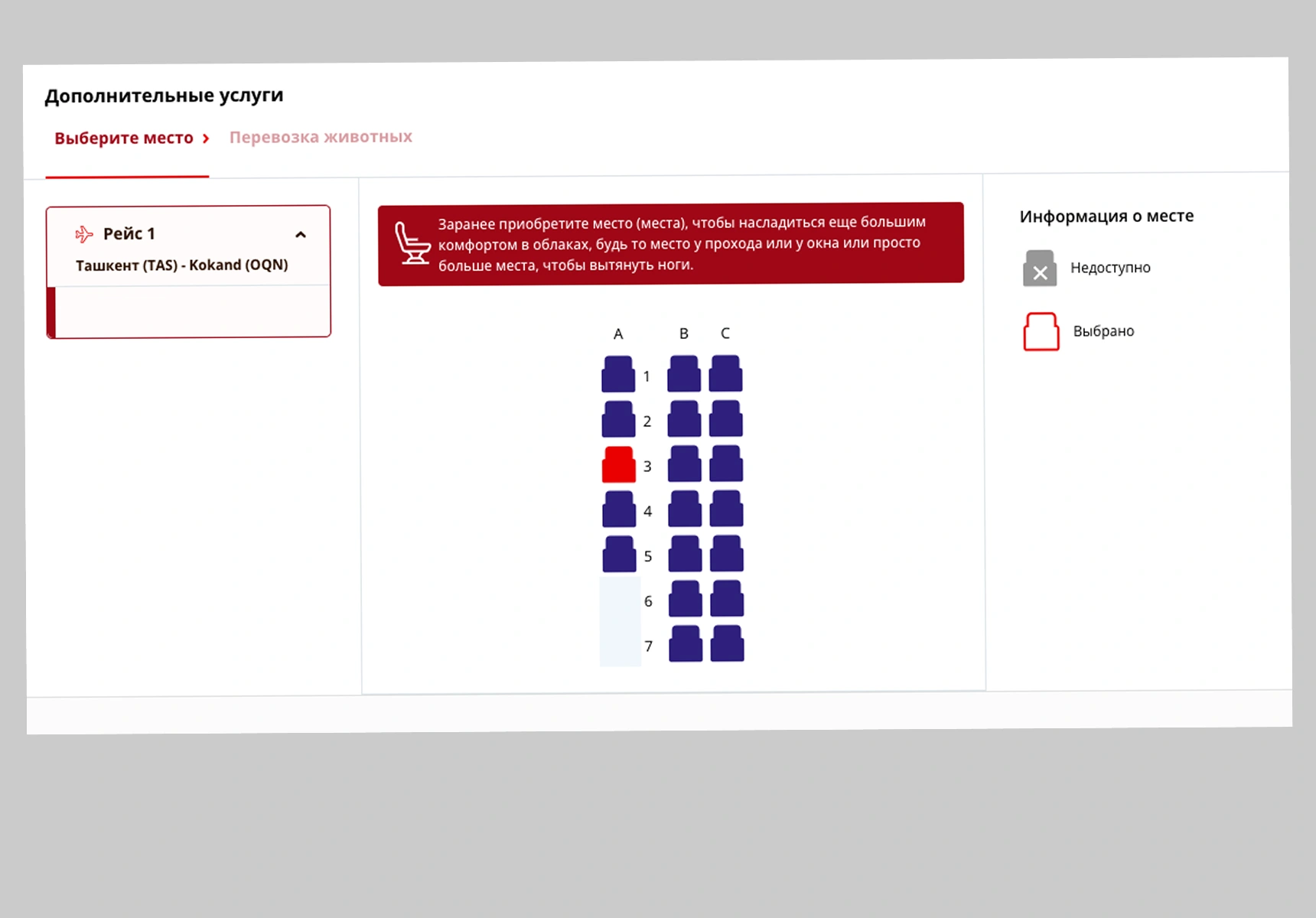 У классических авиакомпаний, например Uzbekistan Airways, подход мягче. Выбрать бесплатное место онлайн можно даже с билетами по базовому тарифу — из тех, что доступны, некоторые сидения будут платными. Но при этом сами билеты у таких авиакомпаний стоят дороже.