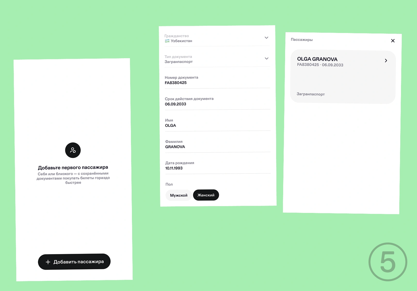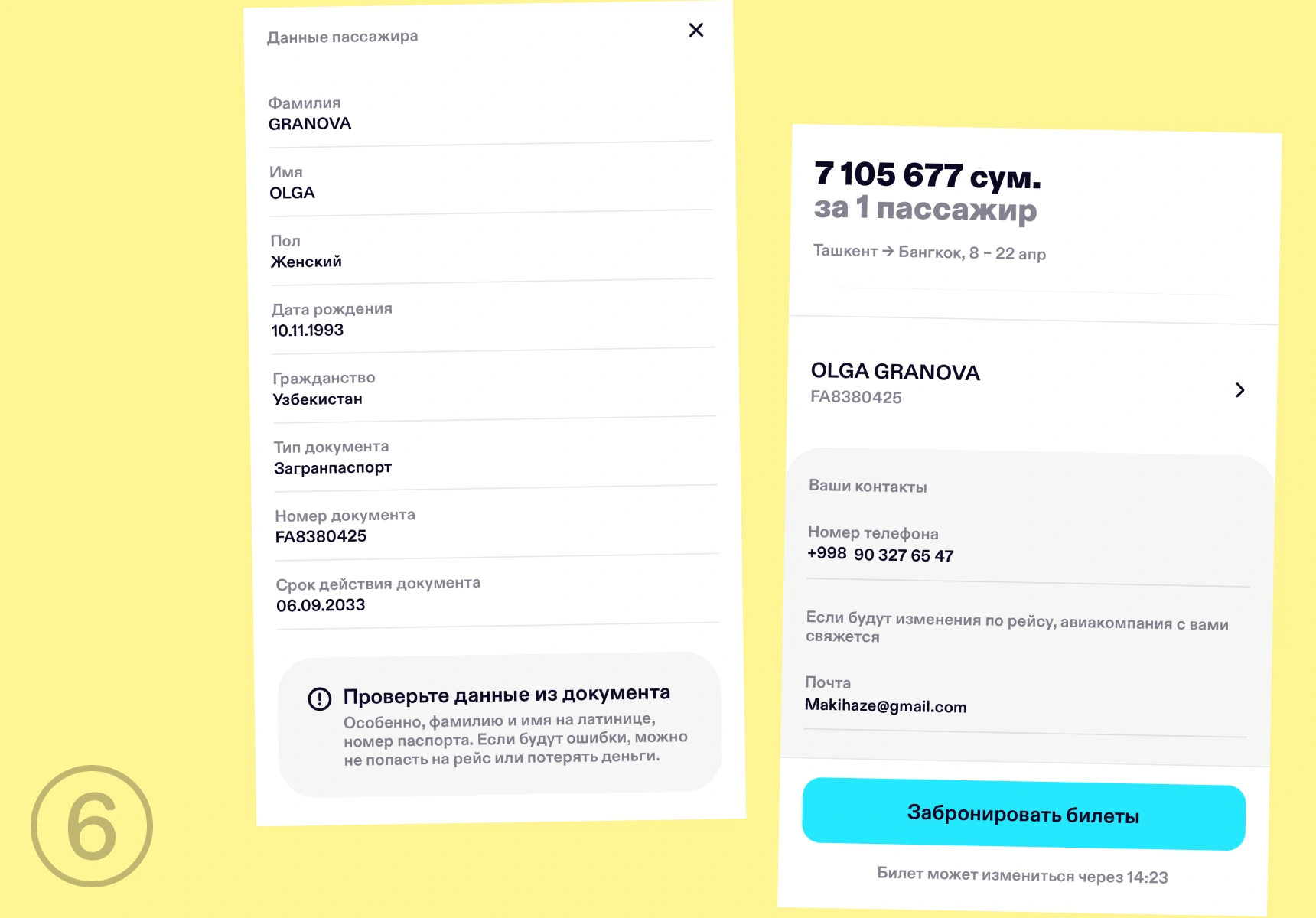 Шаг 5. Введите данные пассажиров. Нажмите «Перейти к пассажирам» и внесите данные, в том числе документов: ID-карты для внутренних рейсов или загранпаспорта для зарубежных. Всё сохранится в приложении — это ускорит следующие покупки: информацию не придётся вводить каждый раз. Также сохранятся данные всех, для кого вы покупаете билеты. Можно добавить пассажира с паспортом любой страны — не только Узбекистана.