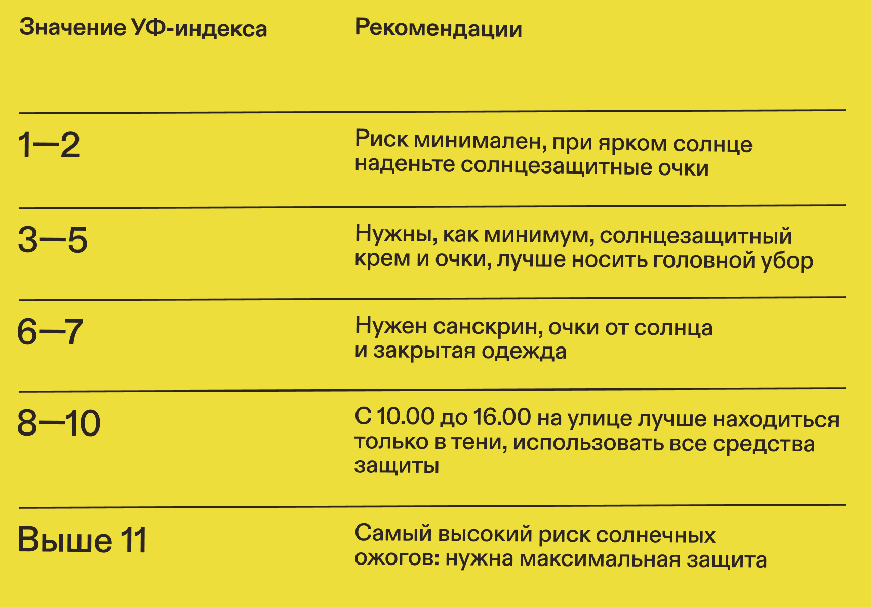 Посмотреть УФ-индекс можно в любом погодном приложении: если он равен 3 или больше, значит, нужен солнцезащитный крем, а иногда и другие меры защиты. То есть только санскрина мало: когда солнце активно, особенно при УФ-индексе выше 5, стоит также носить солнцезащитные очки и головной убор, а тело прикрывать одеждой.