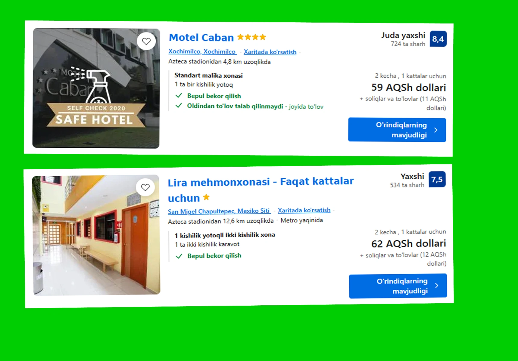 Google Hotels. Bir xil mehmonxona qayerda arzonroq ekanini ko‘rsatadi. Yakuniy narxni tekshirish uchun yaxshi yordamchi.
