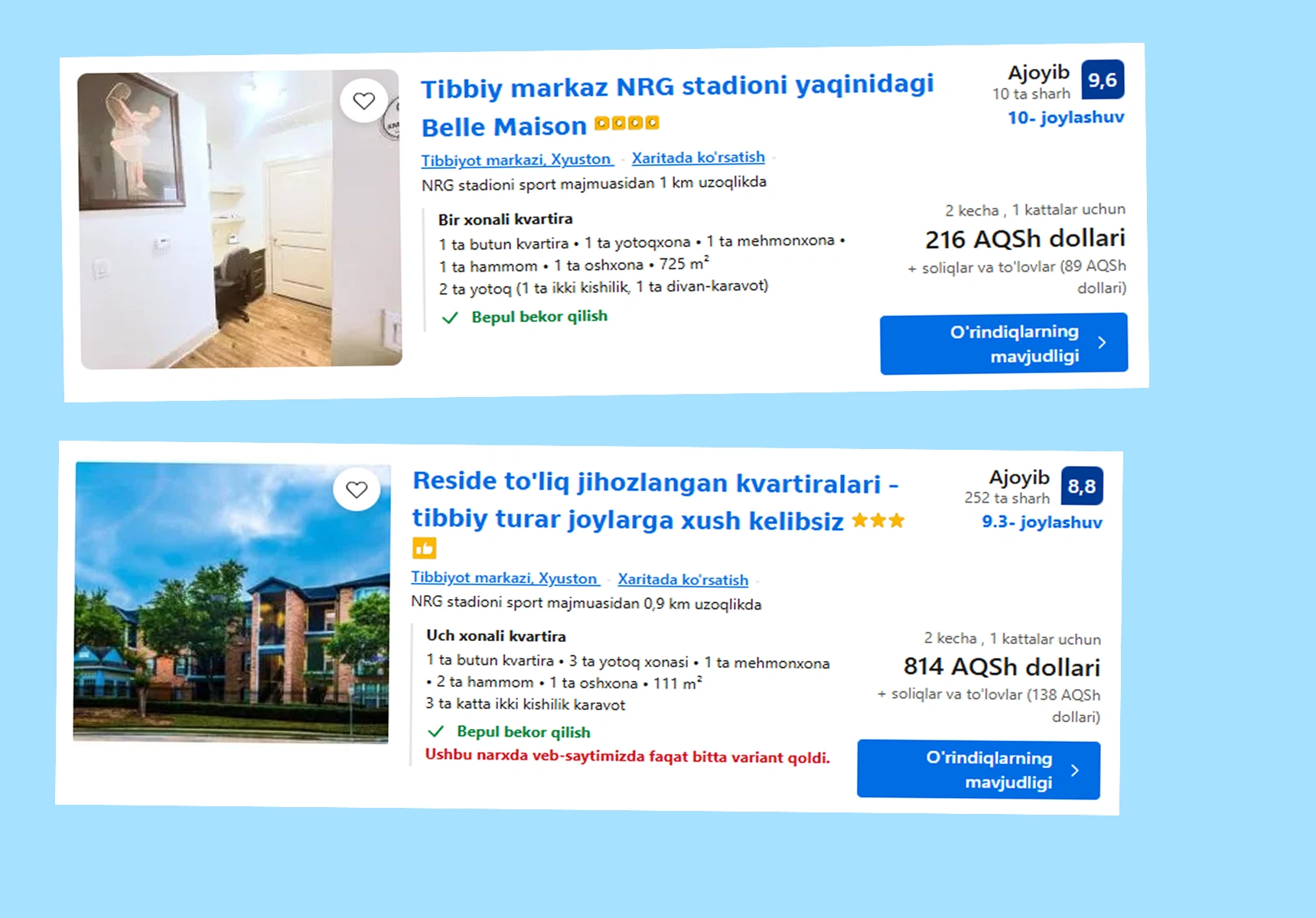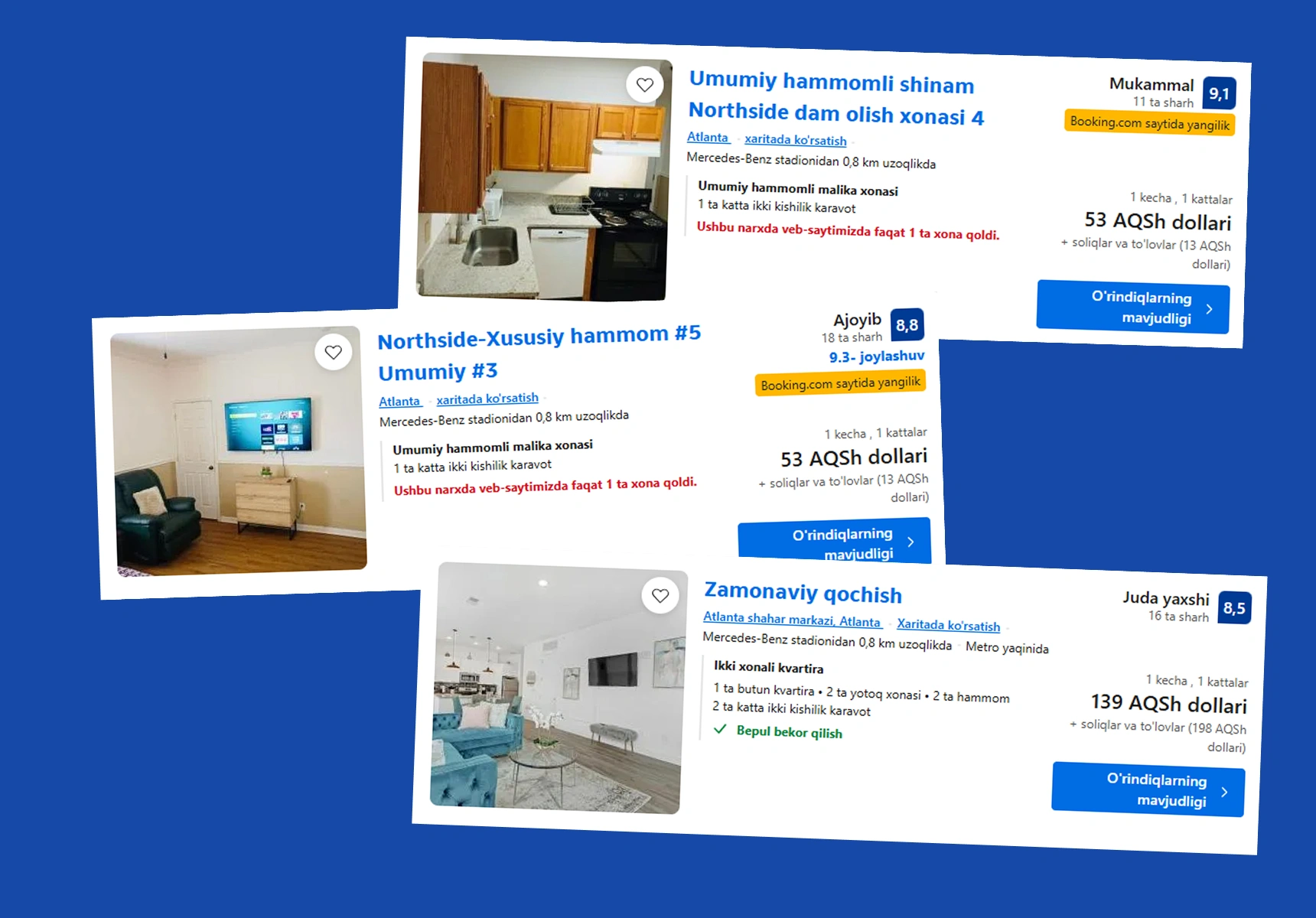 Servislarni ishlatmasa-chi? Bu yo‘lni tavsiya qilmaymiz. Arzon kvartira egasi pulni o‘tkazganingizdan keyin g‘oyib bo‘lishi yoki manzilga borganingizda uy umuman kutganingizdek chiqmasligi mumkin. Platforma orqali to‘laganingizda, pulni qaytarish mexanizmi ishlashi kerak. To‘lovni to‘g‘ridan-to‘g‘ri qilsangiz, muammolarni o‘zingiz hal qilishingizga to‘g‘ri keladi.