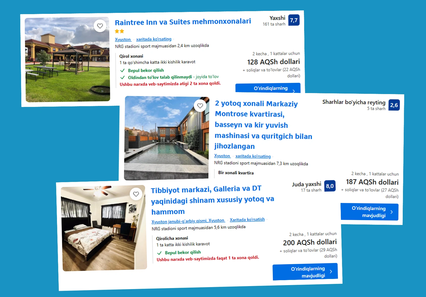 Expedia. 3–5 yulduzli mehmonxonalar va yirik tarmoqlarga mo‘ljallangan. AQSH va Xyustondek yirik shaharlar uchun mos.