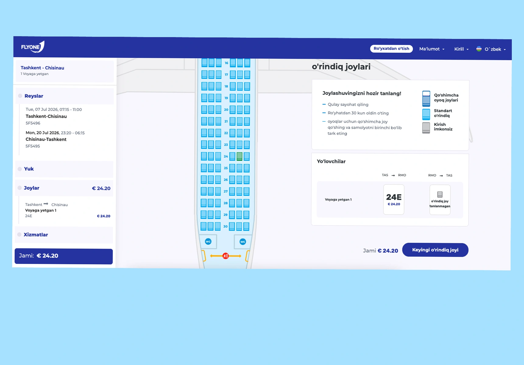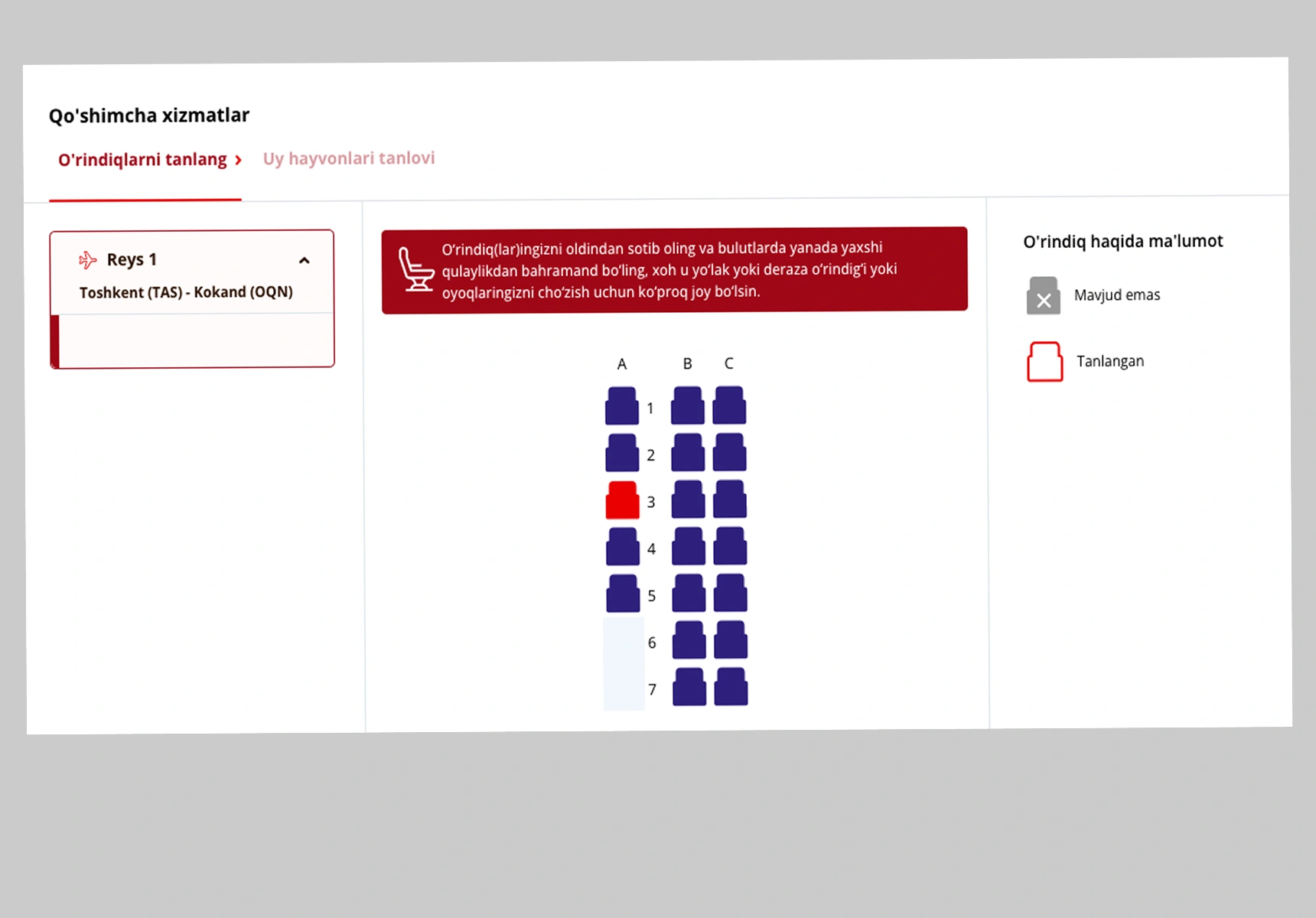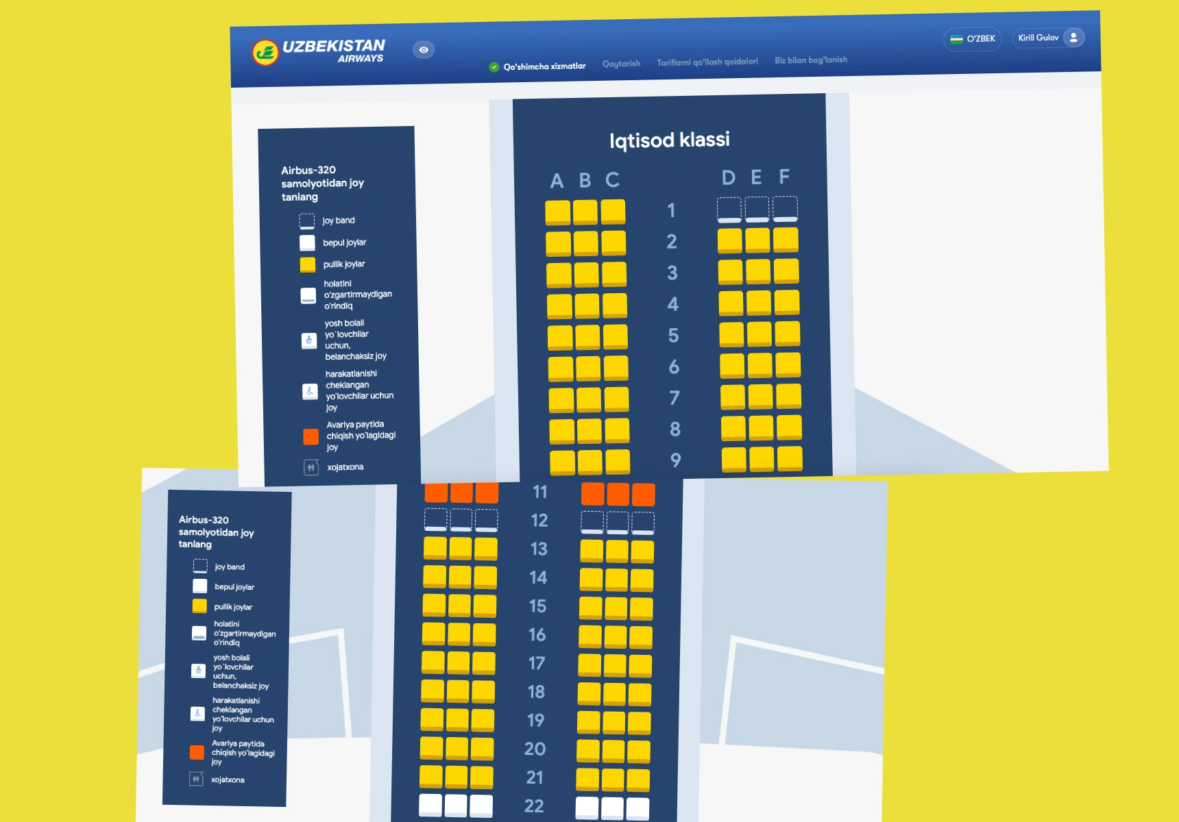 Onlayn ro‘yxatdan o‘tish vaqtida joyni bepul olish ham mumkin — bu holatda bazaviy tariflarda aviakompaniya joyni tasodifiy tartibda o‘zi belgilaydi. Agar siz oilangiz yoki do‘stlar bilan uchayotgan bo‘lsangiz, bu noqulay. Katta ehtimol bilan tizim sizni salonning turli joylariga o‘tqazib qo‘yadi.