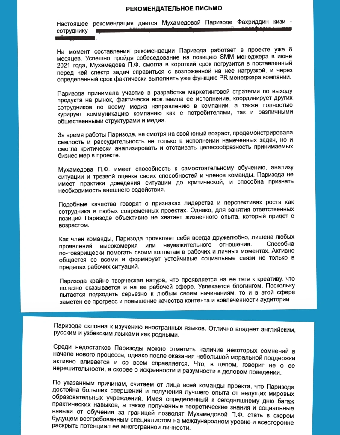 Men, uchta tavsiyani ilova qildim: ikkitasi maktab o‘qituvchilarimdan va bittasi ish joyimdagi direktordan. Muhimi, xatlar rasmiy bo‘lib, imzo va muhr bilan tasdiqlangan bo‘lishi kerak.