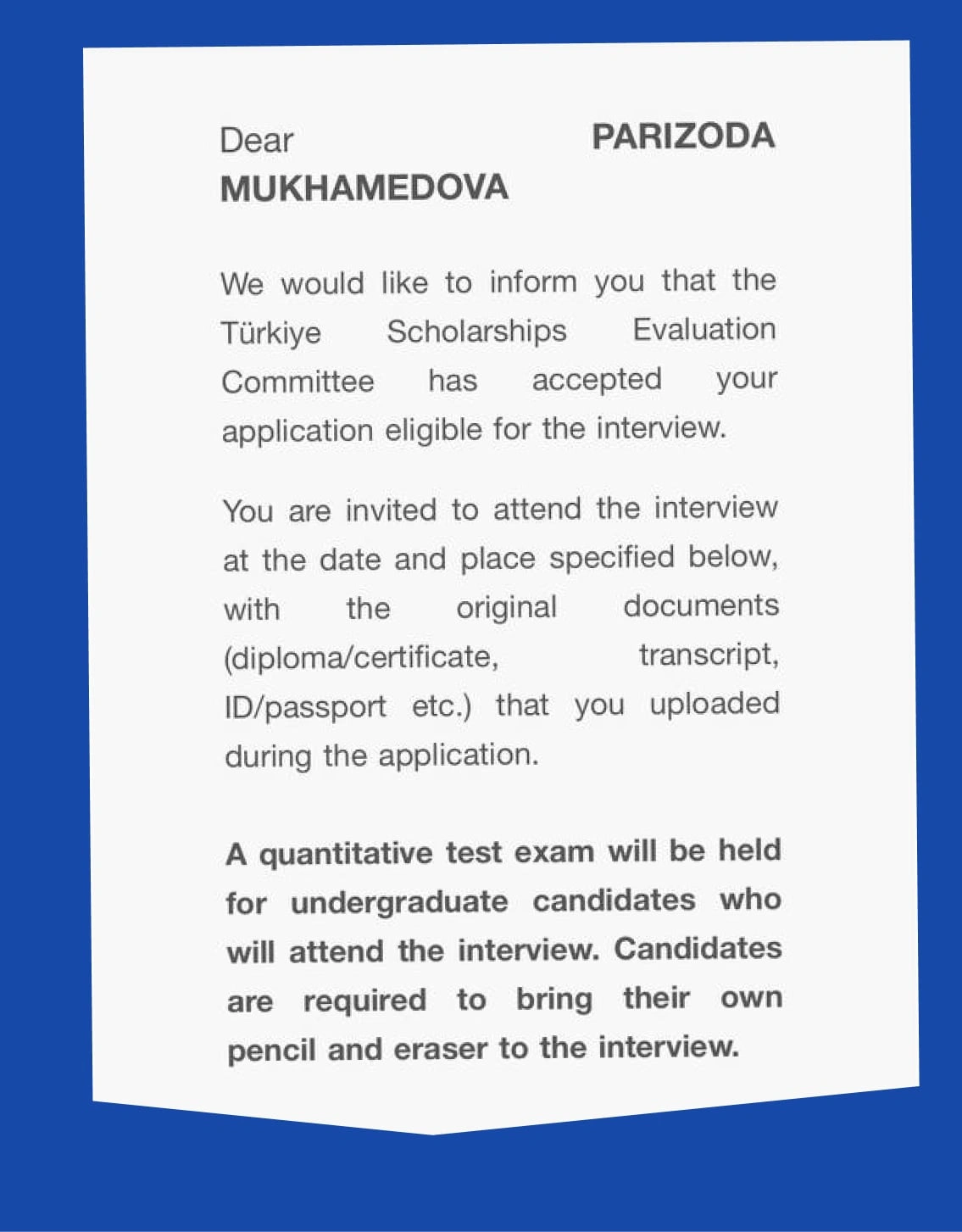 To‘xtamay gapirishga harakat qildim, rejalarim va qiziqishlarim haqida aytib berdim, nima uchun Turkiyani va ushbu dasturni tanlaganimni tushuntirdim. Menimcha, bu o‘z ta’sirini ko‘rsatdi: komissiya mening qarorim qat’iy ekanligini va chindan ham o‘qishga intilayotganimni ko‘rdi.