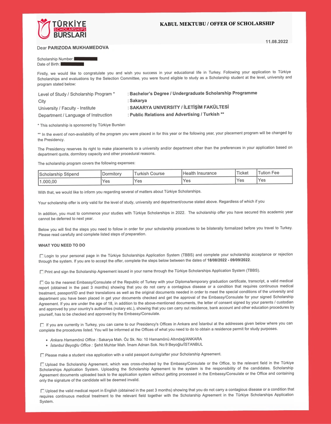 Xatda o‘qishga kirish tasdig‘i yoki rad etilganligi haqida ma’lumot bo‘lishi mumkin. Qabul qilinsangiz, universitet, mutaxassislik va ta’lim shaklini ko‘rsatishadi. Komissiya talabalarni so‘rovnomada ko‘rsatilgan ustuvorliklar va bo‘sh o‘rinlariga qarab taqsimlaydi. Masalan men, o‘nta universitetni ko‘rsatib, ro‘yxatda ikkinchi bo‘lgan va Istanbulga yaqin joylashgan Sakarya universitetidan joy oldim.