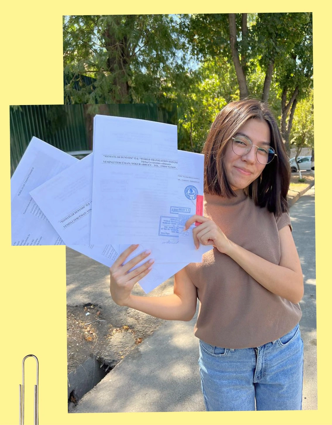 Barcha hujjatlarni turk tiliga tarjima qilish, notarial tasdiqlash va Turkiya elchixonasiga olib borish shart. U yerda hujjatlar to‘g‘ri rasmiylashtirilganligi tekshirilib, muhr bosiladi. Keyin, viza, universitet va yotoqxona manzili ko‘rsatilgan rasmiy tasdiqnomani olasiz.