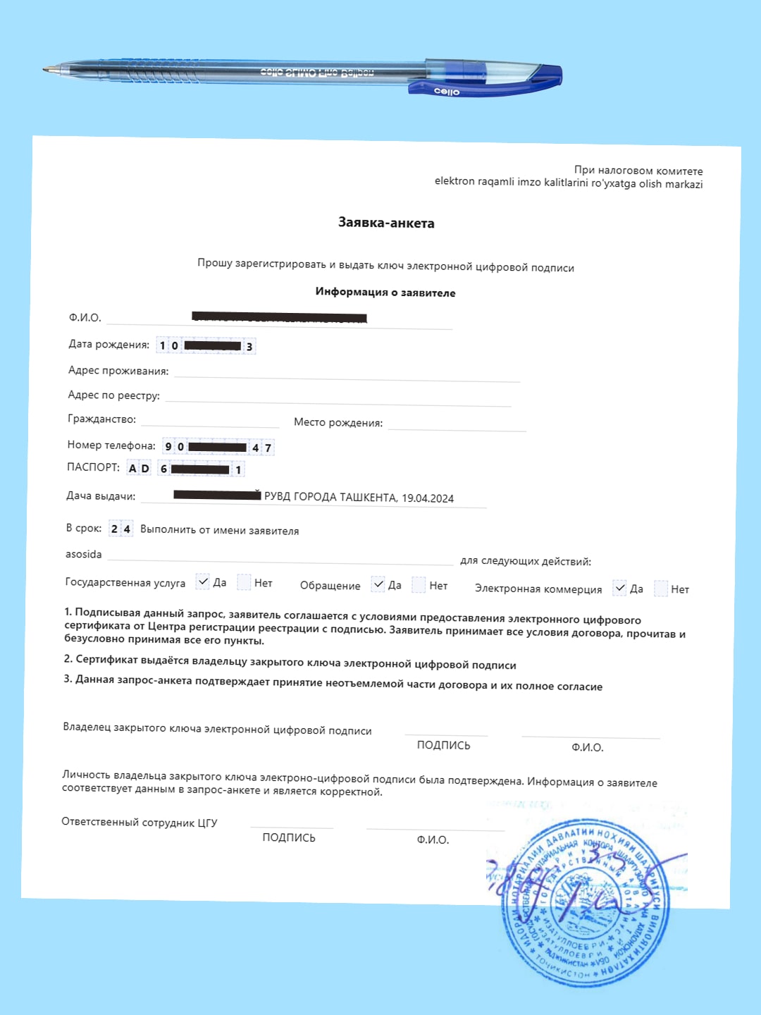 Tayyor — endi sizda elektron imzo bor. Ba’zan arizani rad etishlari mumkin — masalan, anketada noto‘g’ri ma’lumotlarni ko‘rsatsangiz, pasport ma’lumotlari kiritilmagan yoki boj to‘lovi yuborilmagan bo‘lsa. Bu holda jarayonni qaytadan o‘tish kerak bo‘ladi.