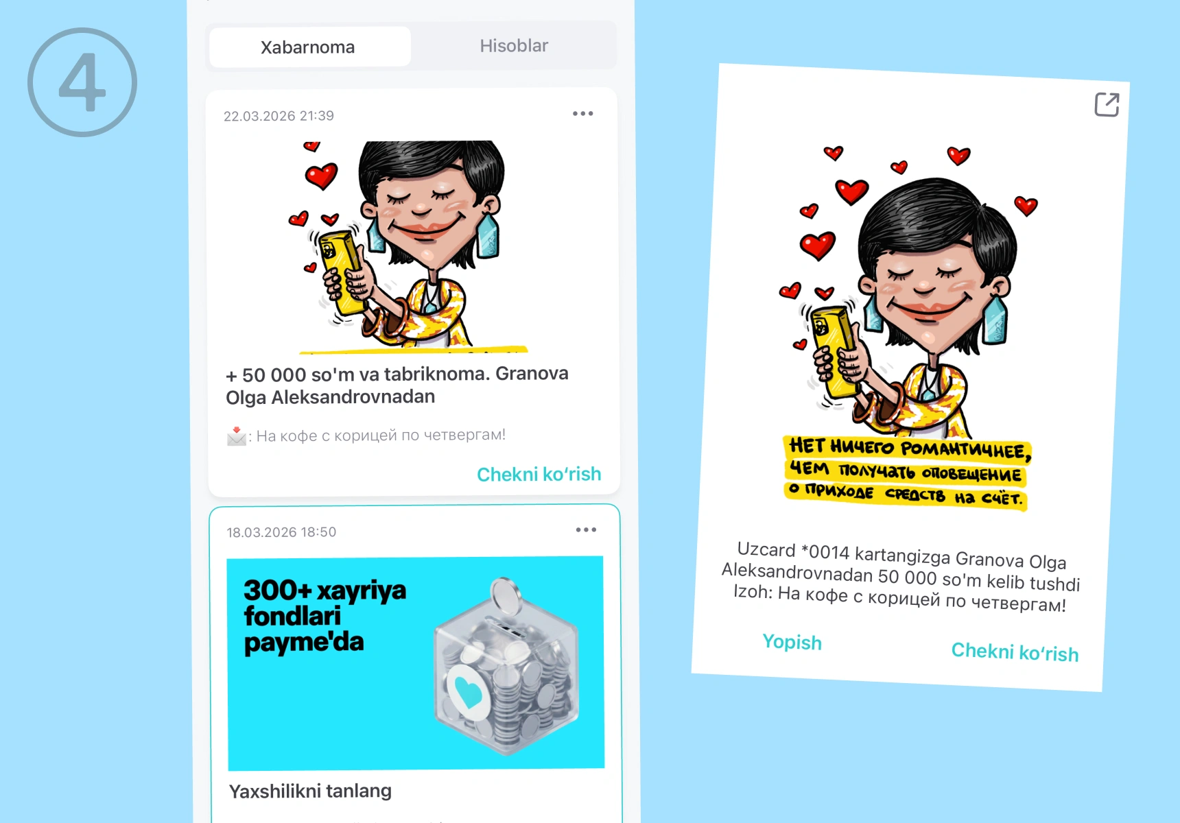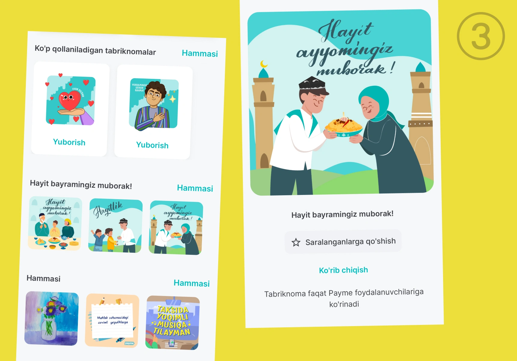 Nima uchun. Yorqin stikerlar yordamida yaqinlarni bayram bilan tabriklash, rahmat aytish yoki shunchaki ko‘nglini ko‘tarish mumkin. Ilovada Navro‘z va Hayit uchun maxsus tabriknomalar, blogerlardan stikerlar, Toshkent mozaikalari aks etgan suratlar, o‘zbek rassomlari va san’atkorlari tomonidan tayyorlangan tabriknomalar bor — tanlov juda katta. Tabriknomani faqat payme foydalanuvchilari ko‘ra oladi.