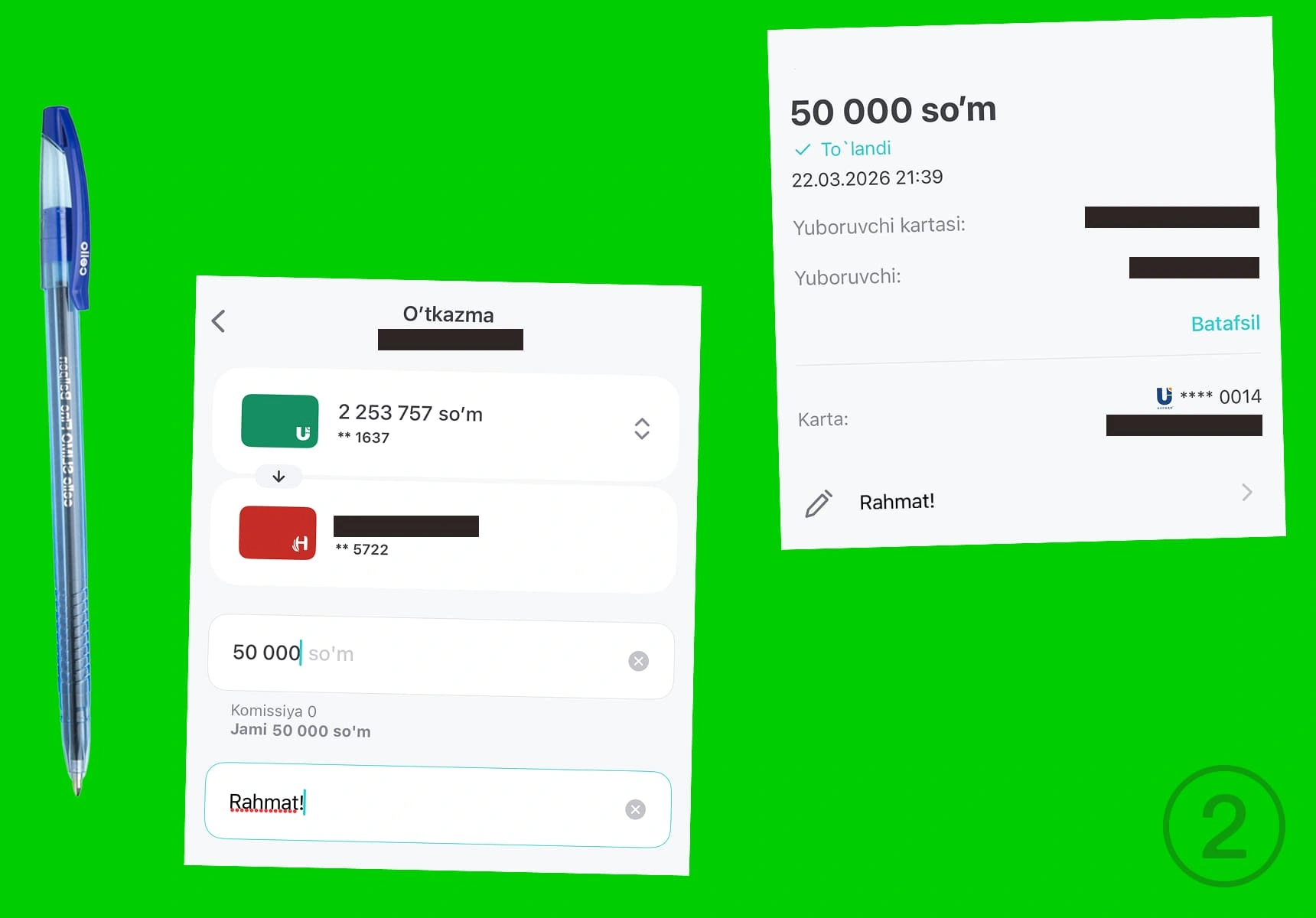 Nima uchun. Pul nima yoki kimdan yuborilganiga aniqlik kiritish uchun. Masalan, singlingizni tug‘ilgan kuniga 500 000 so‘m o‘tkazdingiz yoki do‘stingizga qarzni qaytaryapsiz.