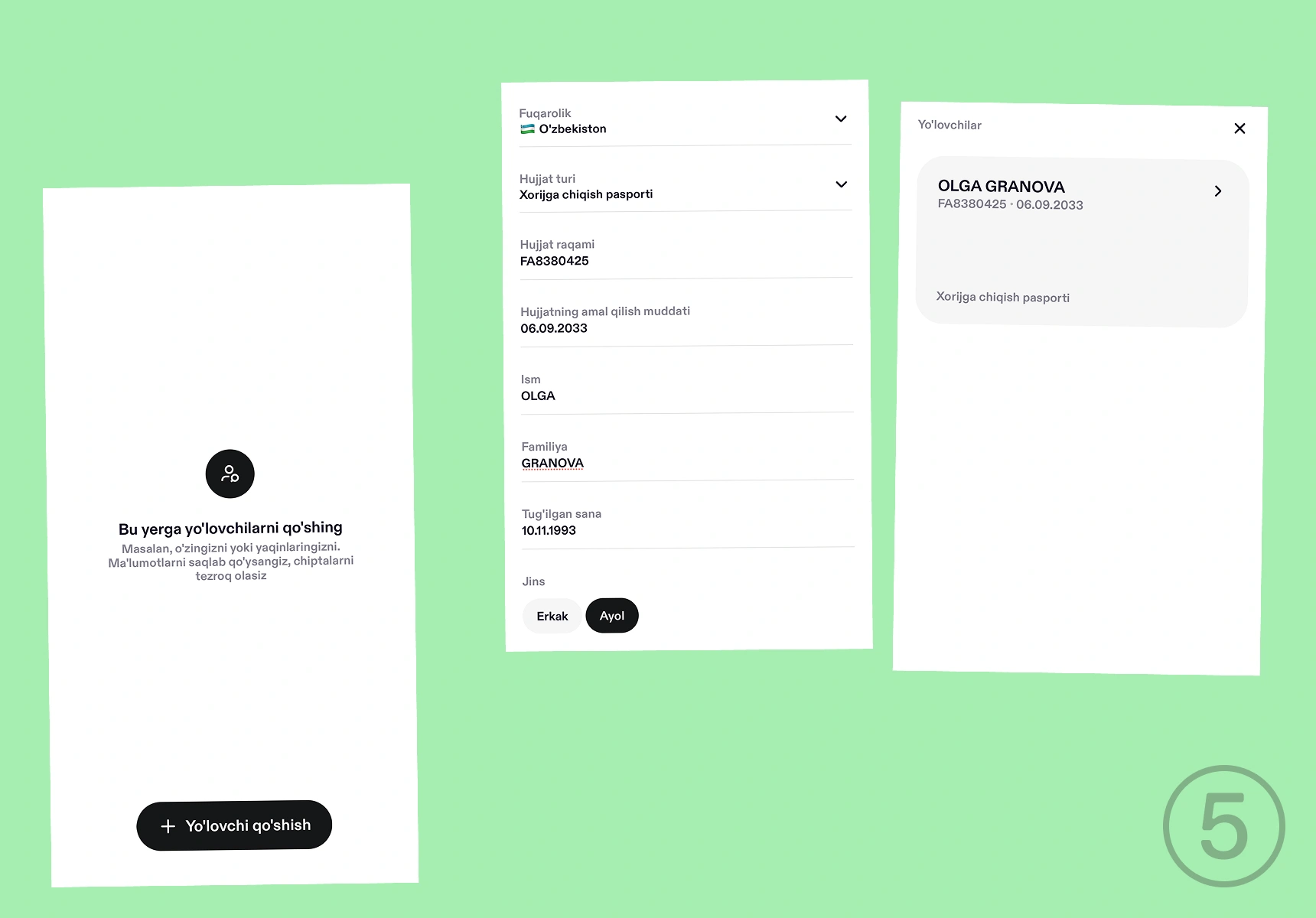 5-qadam. Yo‘lovchi ma’lumotlarini kiriting. “Yo‘lovchilarga o‘tish” tugmasini bosib, ma’lumotlar va hujjatlarni kiriting. Ichki reyslarga ID-karta, xorijiy reyslarga xorijga chiqish pasporti kerak. Barchasi ilovada saqlanadi va keyingi xaridlarni tezlashtiradi. Har safar ma’lumotlarni kiritish kerak bo‘lmaydi. Bundan tashqari kimlar uchun chipta sotib olganingiz haqidagi ma’lumotlar ham saqlanadi. Boshqa mamlakatning pasporti bor yo‘lovchini ham qo‘shish mumkin.