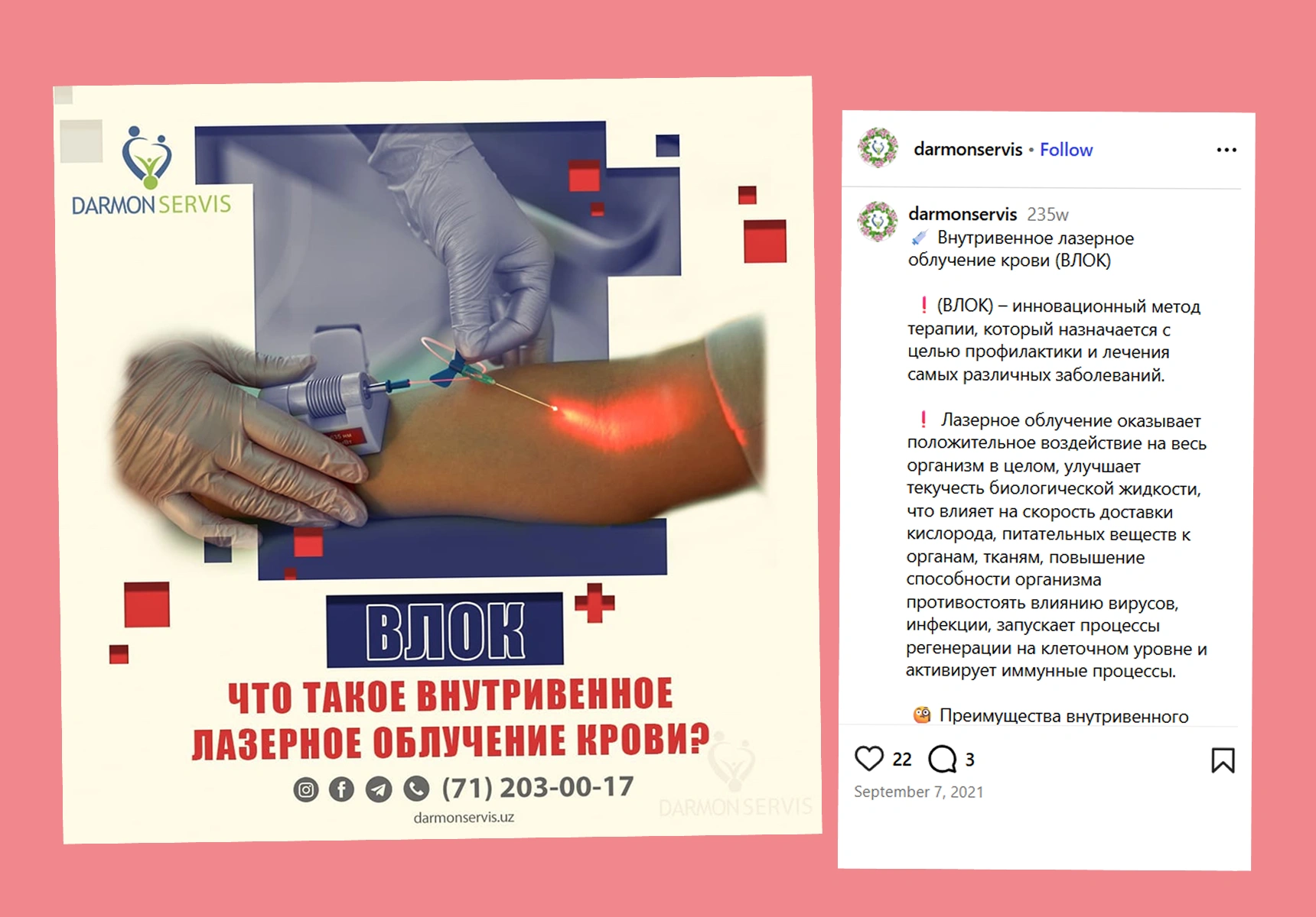 Nega pul sarflashga arzimaydi? Bu muolajaning birorta foydasi haqida ilmiy isbot yo‘q. U na immunitetni ko‘taradi, na yurak va qon tomirlarini yaxshilaydi. Undan tashqari, tomirga igna sanchishning xavflari ham bor — masalan, infeksiya tushib qolishi mumkin.
