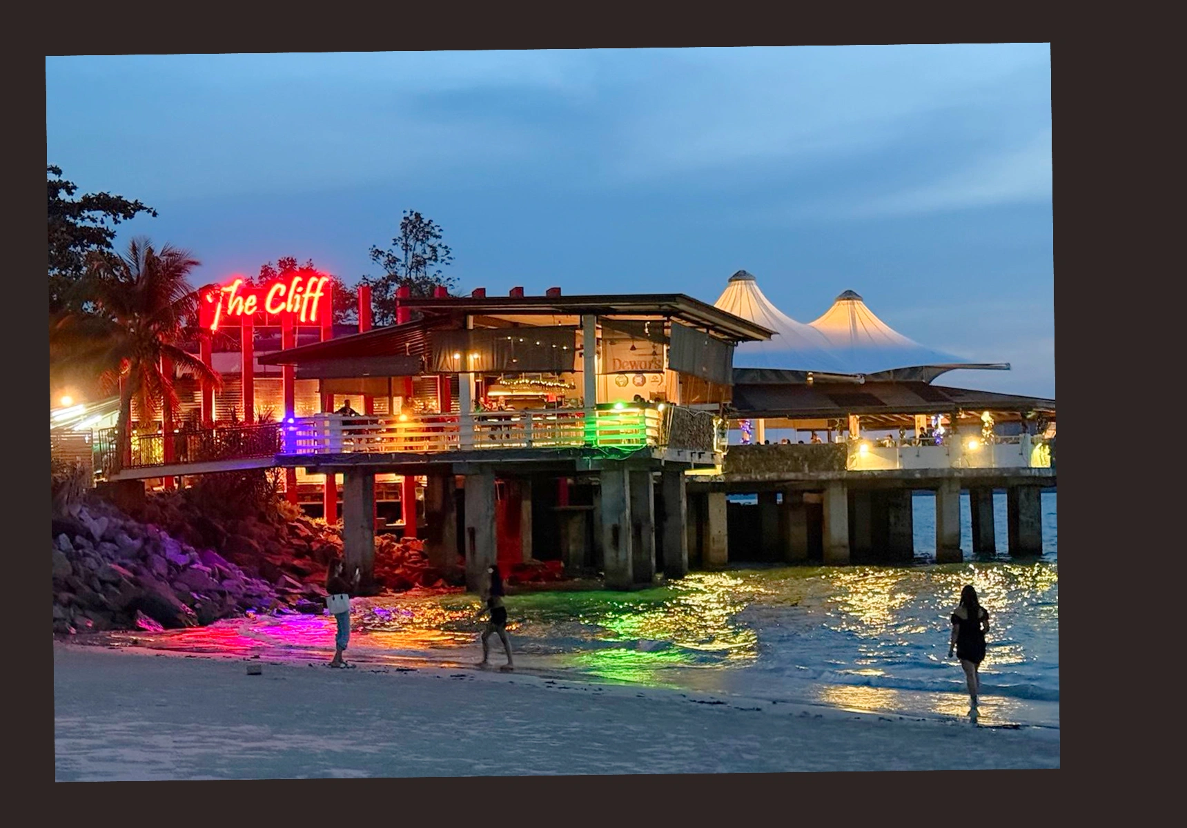 Quyosh botishining eng go‘zal manzarasi uchun The Cliff restoran-bariga bir-ikki marta bordik: u plyajning o‘zida emas, dengiz sathidan balandlikda joylashgan. Ikkita issiq taom, ichimlik va shirinlikdan iborat kechki ovqat 200–300 RM, 620 000–930 000 so‘mga tushadi.