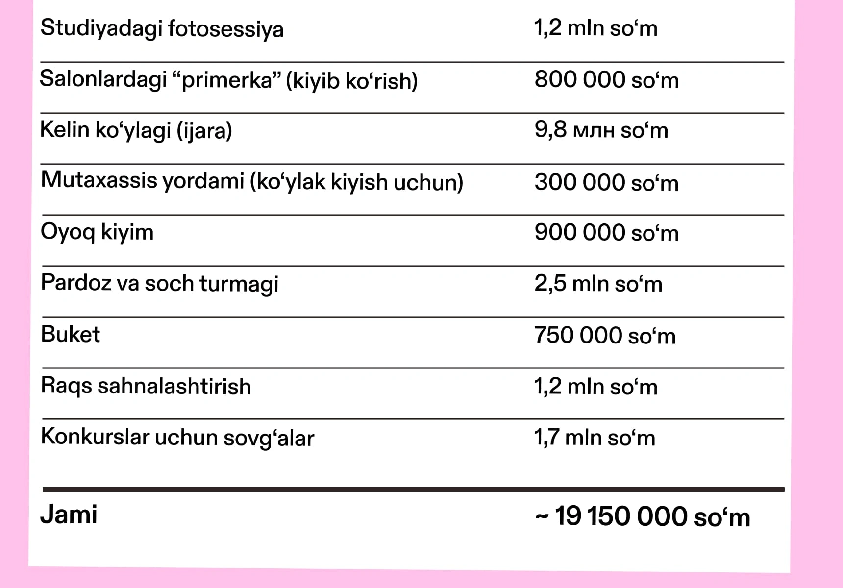 Turmush o‘rtog‘im to‘y uchun taxminan 148 300 000 so‘m sarfladi