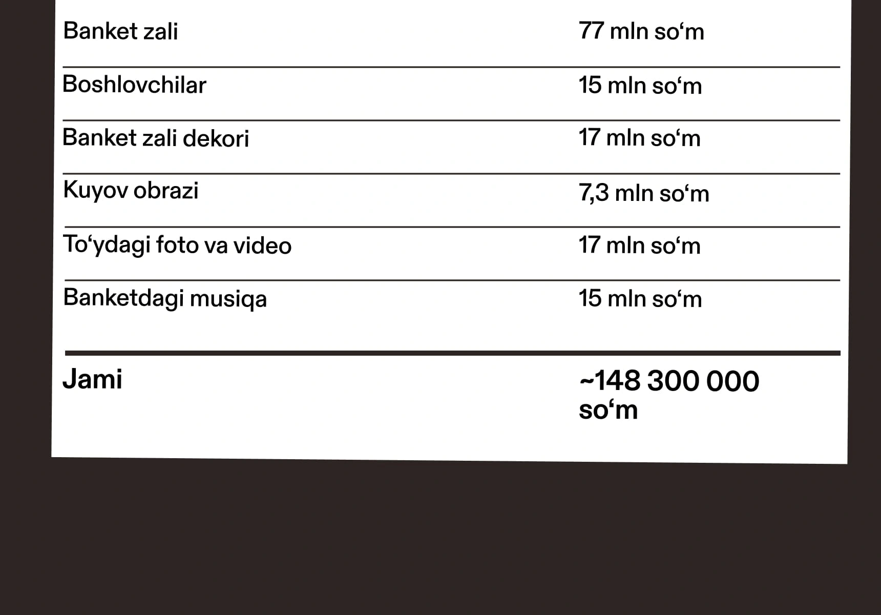 Jami banket xarajatlari 6 300 dollarga (taxminan 77 mln so‘m) tushdi. Restoran bergan dekor uchun esa qo‘shimcha 1 400 dollar (taxminan 17 mln so‘m) to‘ladik.