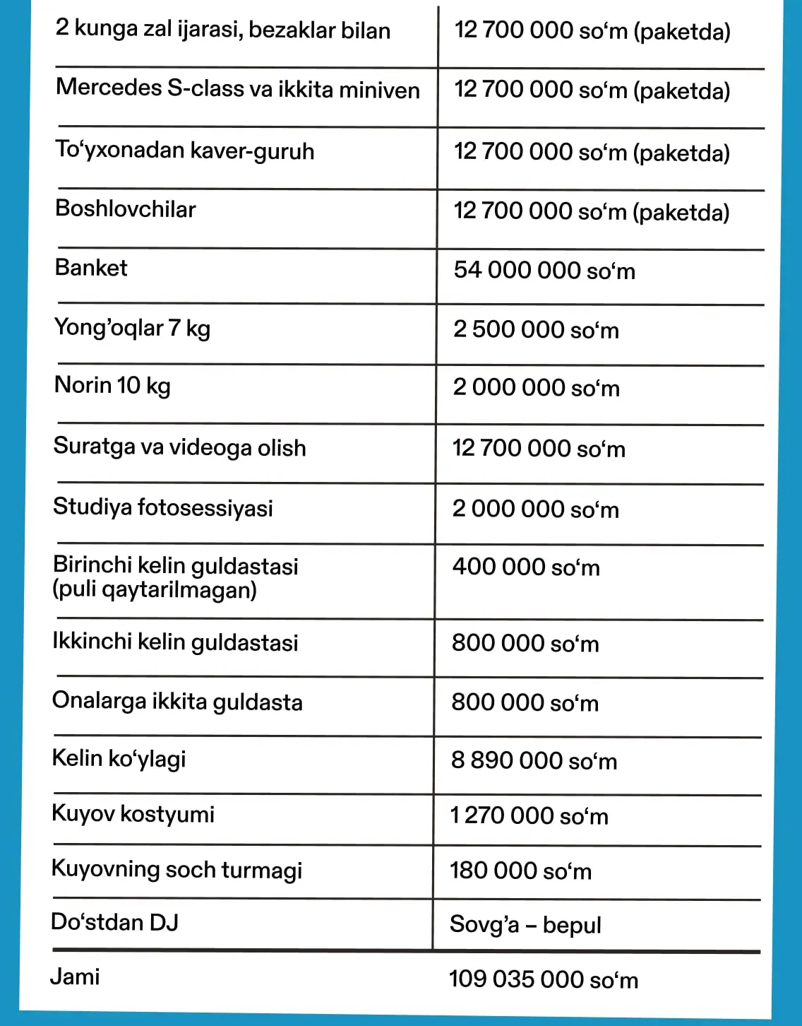 Menyu. To‘yxona taomlar ro‘yxatini berdi, men esa onam va opalarim bilan yakuniy menyuni tuzdik: salatlar, asosiy taomlar, go‘shtli assorti, somsa, mevalar va yengil gazaklar. “Tarvuz qayiqlari” kabi noodatiy narsalardan voz kechdik, oddiy va mazali bo‘lishini xohladik. Bir mehmon uchun menyu narxi o‘rtacha 450 ming so‘m chiqdi. Yana uy ovqatlarini ham olib kelishga ruxsat berishdi. Qarindoshim norin tayyorladi, onam esa yong‘oq oldilar. Qolgan ovqatni esa onam keyin qarindoshlar va qo‘shnilarga tarqatib yubordilar.