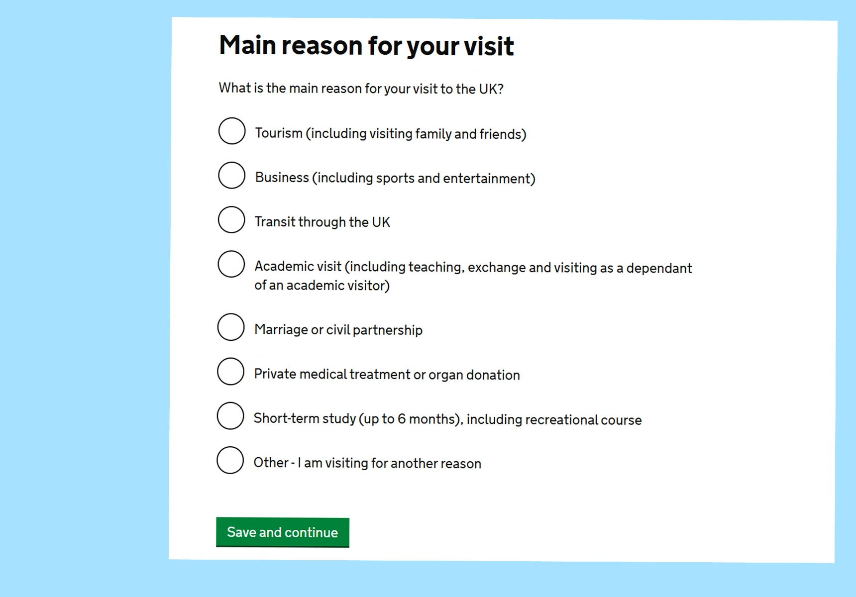 Boshida tizim savollar tilini tanlashni so‘raydi. Ingliz, rus va boshqa tillar bor, o‘zbek tili yo‘q. Lekin, baribir ingliz tilida javob berish kerak. Keyin viza turini tanlaysiz, turistik viza uchun bu “Visit or transit visa”.